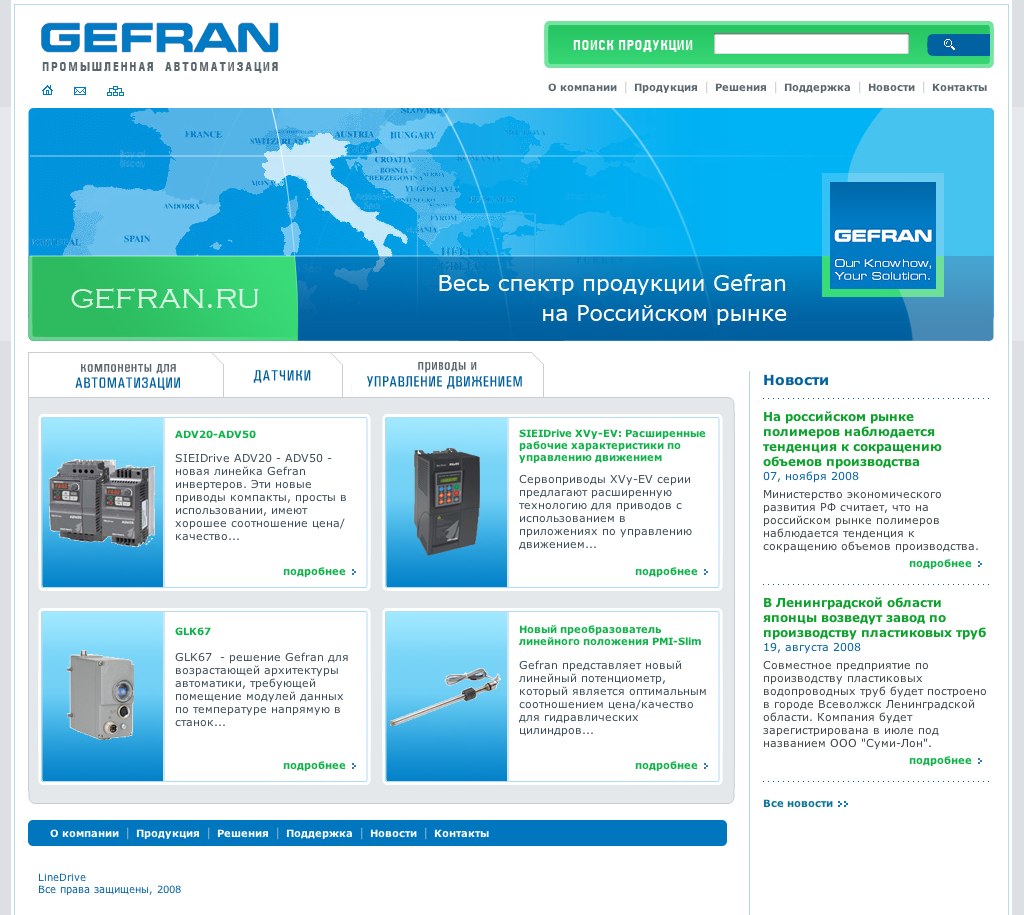 GEFRAN - Βιομηχανική αυτοματοποίησηΙστοσελίδα της εταιρίας “Linedrive” η οποία προωθεί την μάρκα "Gefran" στη Ρωσία. Η παραγωγή και η πώληση των μερών για αυτοματοποίηση, δεικτών, συστημάτων χειρισμού κίνησης.
